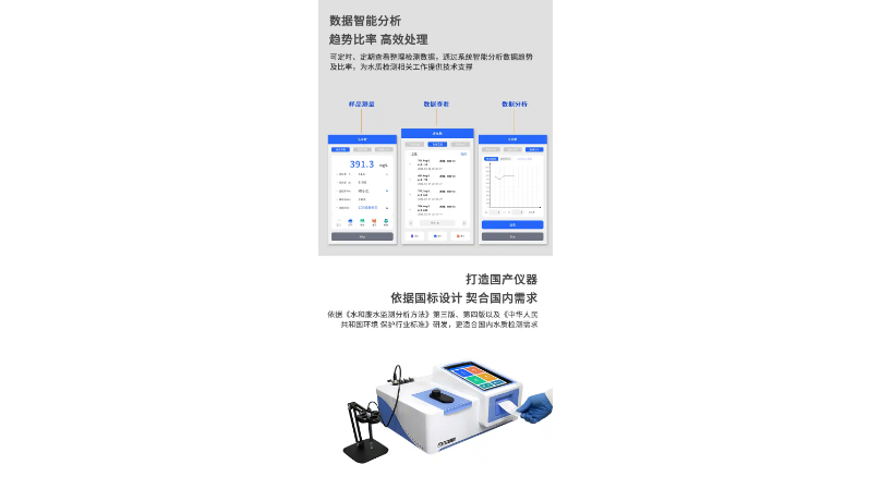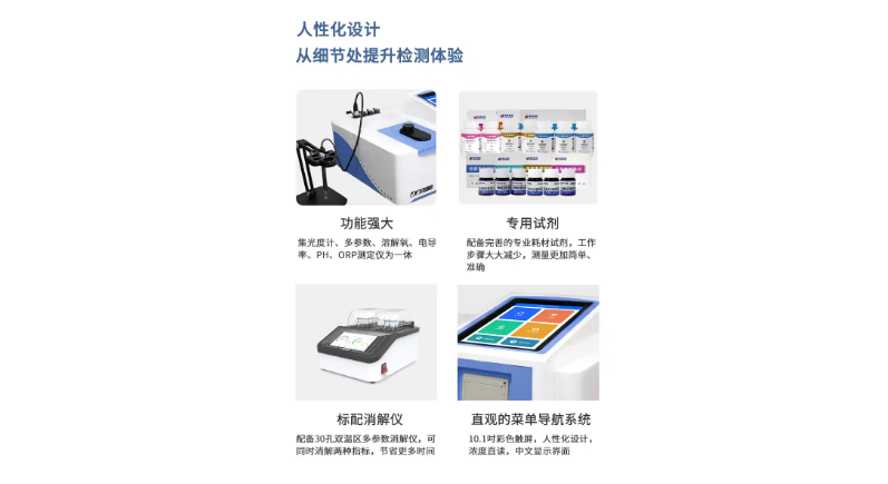 2. 本机设计符合COD-《HJ/T399-2007》、氨氮-《HJ535-2009》、总磷-《GB11893-89》、总氮-《HJ636-2012》标准,可作为水质检测实验室的常规使用仪器。