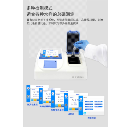 1、多种测定模式:具有双光路无干涉系统,可测定低量程总磷、高量程总磷。支持皿比色和管比色、预制试剂等多种测量模式;